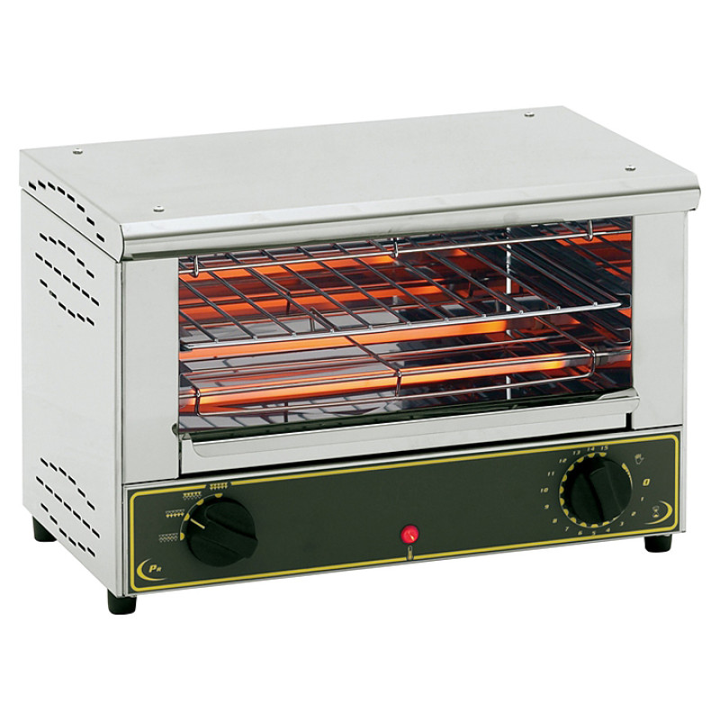 Корпус выполнен из нержавеющей стали. Оснащен инфракрасными кварцевыми трубками, которые обеспечивают быстрый и равномерный прогрев продуктов. Электромеханическая панель управления с тумблером регулирования мощности и таймером на 15 минут. Оборудован поддоном для крошек. Тэны в качестве инфракрасных кварцевых трубок, защищенные решеткой.