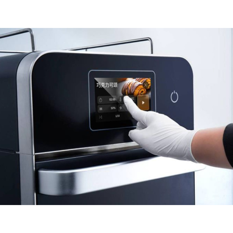 • На печке установлен 5-дюймовый сенсорный экран с USB портом, память на 1024 рецепта, каждая из которых может состоять максимум из 15 стадий приготовления